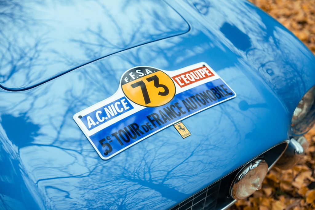 Chassis 0557GT, the most important Tour de France example of the long-wheelbase 250 GT, is the ninth of 14 first-series cars and the seventh of only nine to be clothed in Scaglietti’s louvre-less coachwork. Sold to de Portago on 23 April 1956, the car took some months to prepare, with original build sheets showing the specification of the rear axle on 28 August and the powerful Tipo 128B engine on 10 September. Registered with Italian tags reading BO 69211 and wearing race number 73, the car was ready to take on Europe’s most difficult endurance race of the 1950s/60s. Following the car’s famous victory in the Tour de France Auto, de Portago drove the Berlinetta to a 1st overall finish at the Coupes du Salon at Montlhéry, while two weeks later the car achieved a 1st in class finish at the Rome Grand Prix. Portago’s final triumph in this car came the following year at the Coupes USA on 7 April, where he once again took 1st overall, achieving an undefeated period competition history for this magnificient chassis.